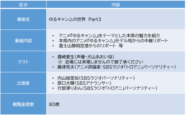 静岡県は、本県や山梨県などが舞台のキャンプをテーマとしたアニメ『ゆるキャン△』シリーズをテーマにしたラジオ番組の公開生放送を富士山静岡空港において実施します。