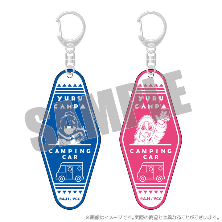 「ゆるキャン△ピングカー」専用のなでしことリンの描き下ろしイラストを使用した特製のレトロな雰囲気のモーテルキーホルダー。なでしことリンのイメージカラーで、キャンピングカーのイラストが入った限定オリジナルデザイン。バイクや自転車、家の鍵などと一緒に!