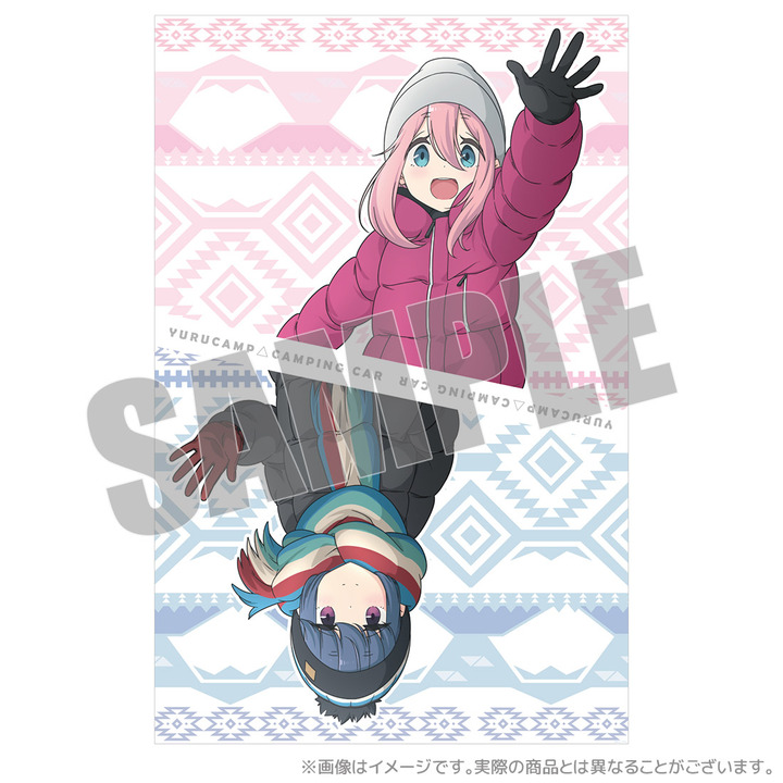 「ゆるキャン△ピングカー」の描き下ろしイラストを使用した、とっておきのフェイスタオル。手を振るなでしことリンのイラストと、キャピングカーロゴをデザインしました。本栖湖と富士山をナバホ柄調にアレンジしています。