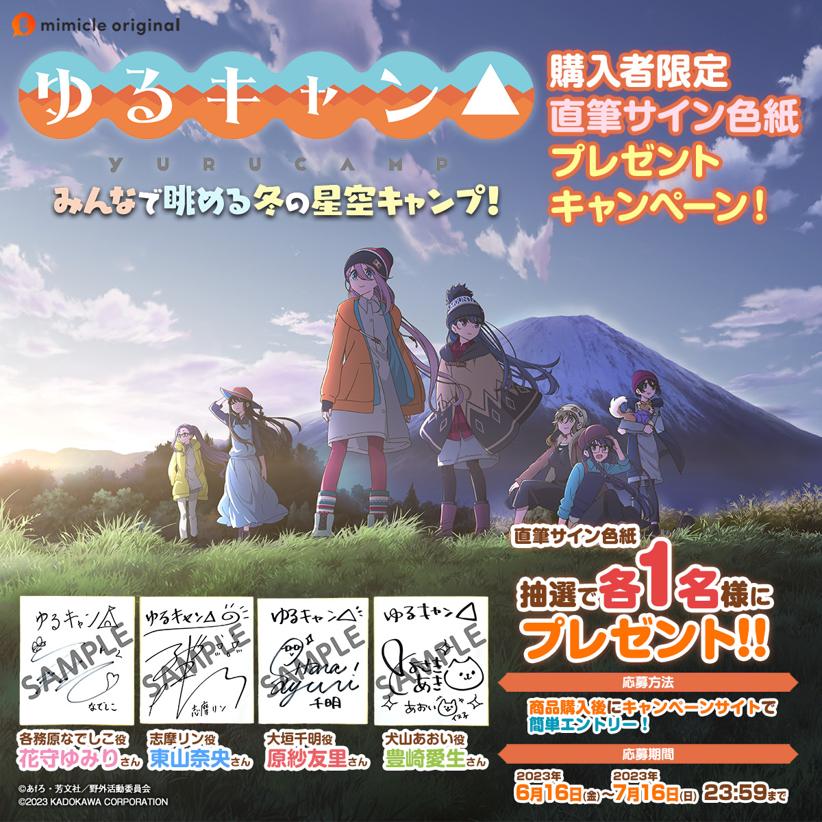 『ゆるキャン△ みんなで眺める冬の星空キャンプ!』の発売を記念してフォロー&RTキャンペーンを開催。キャンペーン期間中にmimicle公式(@mimicleJP)をフォローしたうえでキャンペーンツイートをリツイートすれば応募完了となります。抽選で2名様に「各務原なでしこ役 花守ゆみりさんの直筆サイン色紙」「志摩リン役 東山奈央さんの直筆サイン色紙」「大垣千明役 原紗友里さんの直筆サイン色紙」「犬山あおい役 豊崎愛生さんの直筆サイン色紙」の4枚セットをプレゼントいたします。