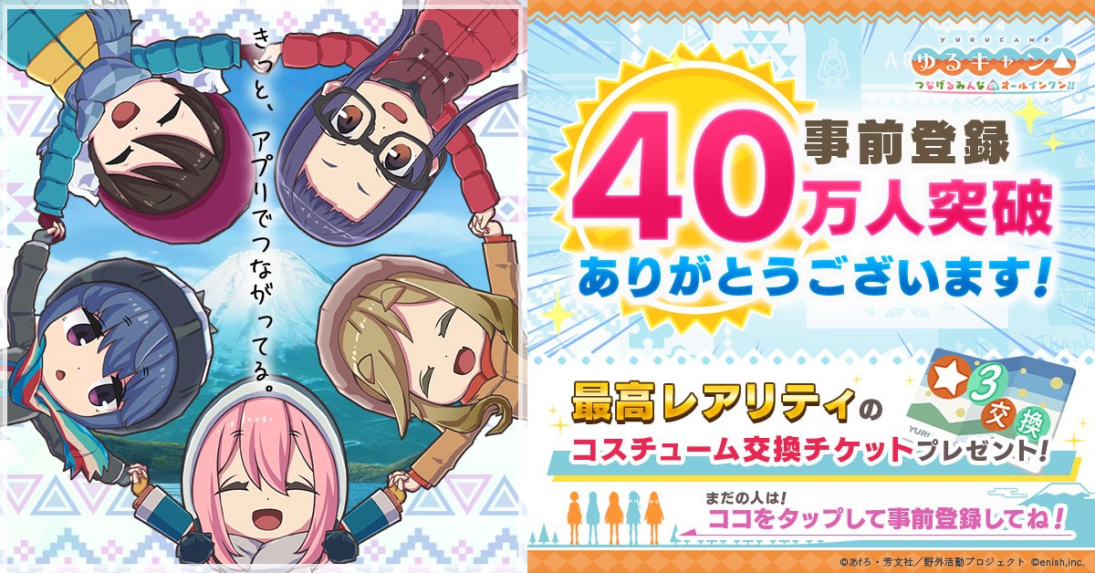 ゲームアプリの企画・開発・運営を行う株式会社enishは、TVアニメ『ゆるキャン△』初となるスマートフォン専用ゲーム「ゆるキャン△ つなげるみんなのオールインワン!!」の事前登録者数が40万人を突破したことを発表した。突破報酬として、好きなキャラクターの最高レアリティ(★3)コスチュームとの交換チケットが配布される。また、「各務原なでしこ」「犬山あおい」の誕生日を記念して、映画『ゆるキャン△』のBlu-ray 【コレクターズ版】がもらえるSNSキャンペーンや、最高1万円分のAmazonギフト券が77名に当たるRTキャンペーンも開催中である。