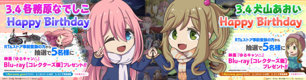 TVアニメ『ゆるキャン△』のキャラクター「各務原なでしこ」「犬山あおい」の誕生日を記念して、つなキャン△公式TwitterにてRTキャンペーンを開始いたしました。