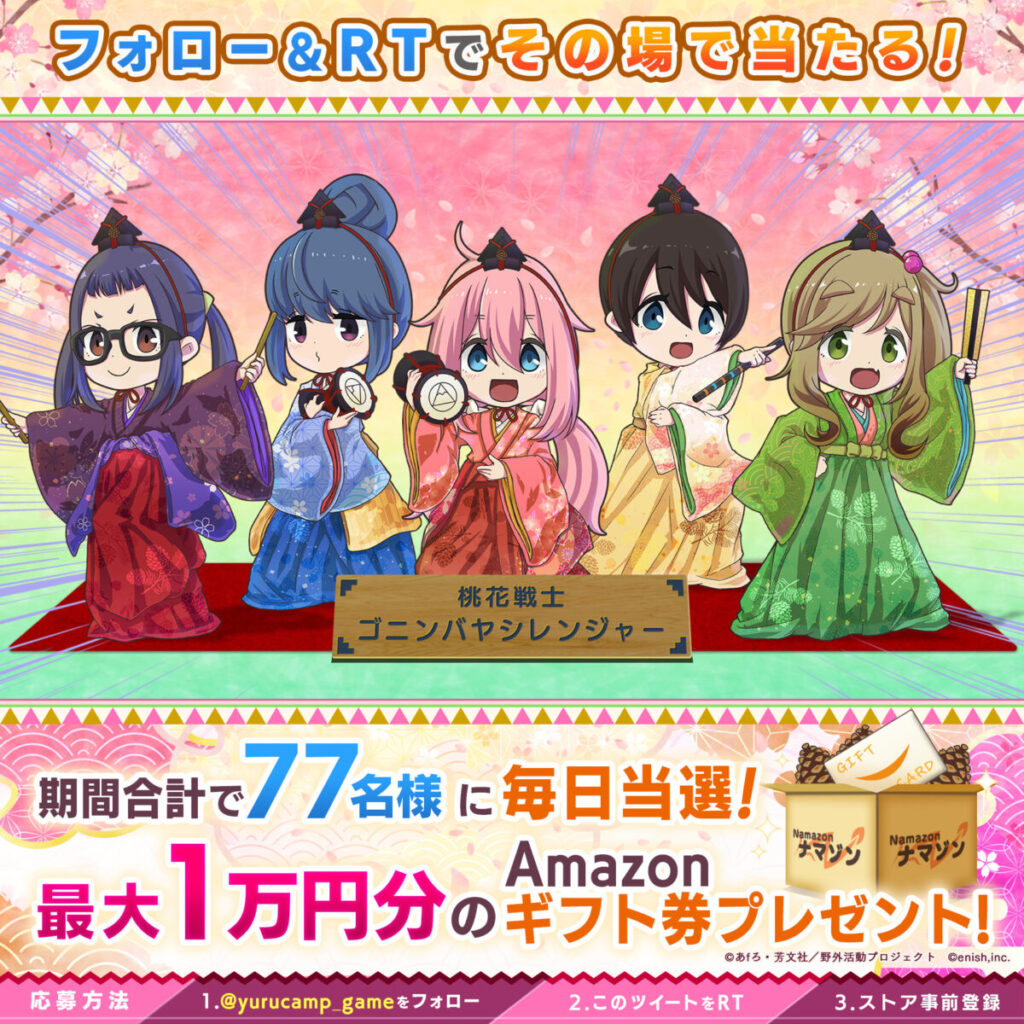 株式会社enish(本社:東京都港区、代表取締役社長:安徳 孝平、以下enish)は、2023年3月6日(月)に、TVアニメ『ゆるキャン△』初となるスマートフォン専用ゲーム「ゆるキャン△ つなげるみんなのオールインワン!!」の事前登録者数が40万人を突破したことをお知らせいたします。また、3月4日より、TVアニメ『ゆるキャン△』のキャラクター「各務原なでしこ」「犬山あおい」の誕生日を記念して、映画『ゆるキャン△』のBlu-ray 【コレクターズ版】がもらえるSNSキャンペーンや、最高1万円分のAmazonギフト券が77名に当たるRTキャンペーンも絶賛開催中です。