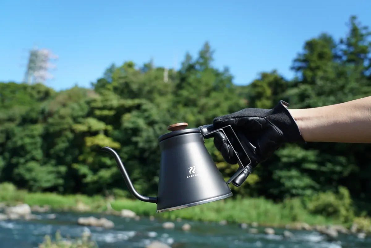 このアイテムは、ゼブラン初となる直火対応で、焚火や調理、コーヒードリップなど幅広いシーンでの使用を想定されたデザインとなっている。グローブ装着時でもグリップしやすい二重取っ手構造に加え、細口ノズルでいつでもドリップが可能だ。