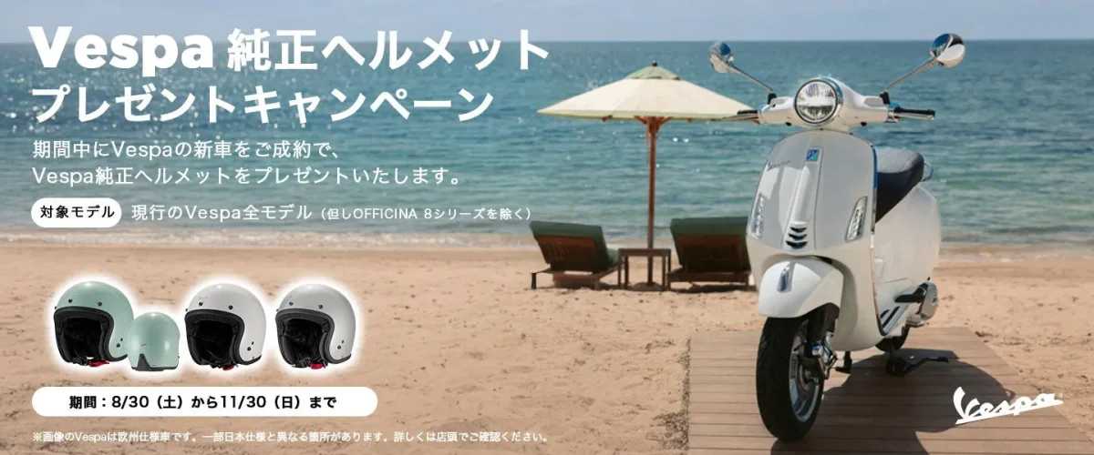 ピアッジオグループジャパンは、2025年8月30日から11月30日まで、ベスパ新車購入者を対象としたキャンペーンを実施する。期間中、現行Vespa全モデル(OFFICINA 8シリーズを除く)の新車を成約すると、約2万円相当のVespa純正ヘルメットが1つプレゼントされる。このキャンペーンは、ベスパのあるライフスタイルを安全かつスタイリッシュに始めたいと考えるライダーにとって、初期費用を抑えつつ完璧なコーディネートを実現できる魅力的な機会となる。 -