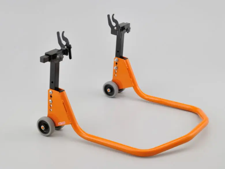 1人でのバイク整備も安心 U型クランプ付き「ワンタッチリアスタンド」