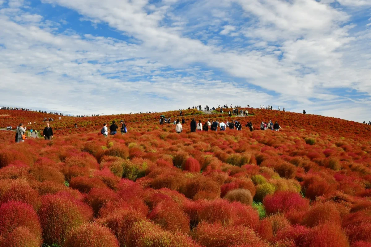 茨城県ひたちなか市に位置する国営ひたち海浜公園では、約4万本のコキアがみはらしの丘を鮮やかな赤に染め上げ、見頃を迎えている。10月17日から25日頃がピークとされ、秋のドライブやツーリングの目的地として、その壮大な景観と季節限定のグルメ、多彩な花畑が注目される。 -